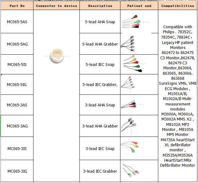 "เข้ากันได้กับฟิลิปส์. 78352C, 78354C, 78834C patient ผู้ป่วยมรดก HP จอภาพจอภาพ 862472 ถึง 862475 C3 จอภาพ, 862478, 862479 จอภาพ C3, 863064, 863065, 863066, 863068 SureSigns VM6, VM8 ECG โมดูล, M1001A / B, M1002A / B, M1002A โมดูลการวัด M3000A, M3001A, M3002A MMS X2, M8102A จอภาพ MP2, M8105A จอภาพ MP5 M4735A heartStart XL เครื่องกระตุ้นหัวใจจอมอนิเตอร์ M3535A / M3536A HeartStart MRx เครื่องกระตุ้นหัวใจจอภาพ